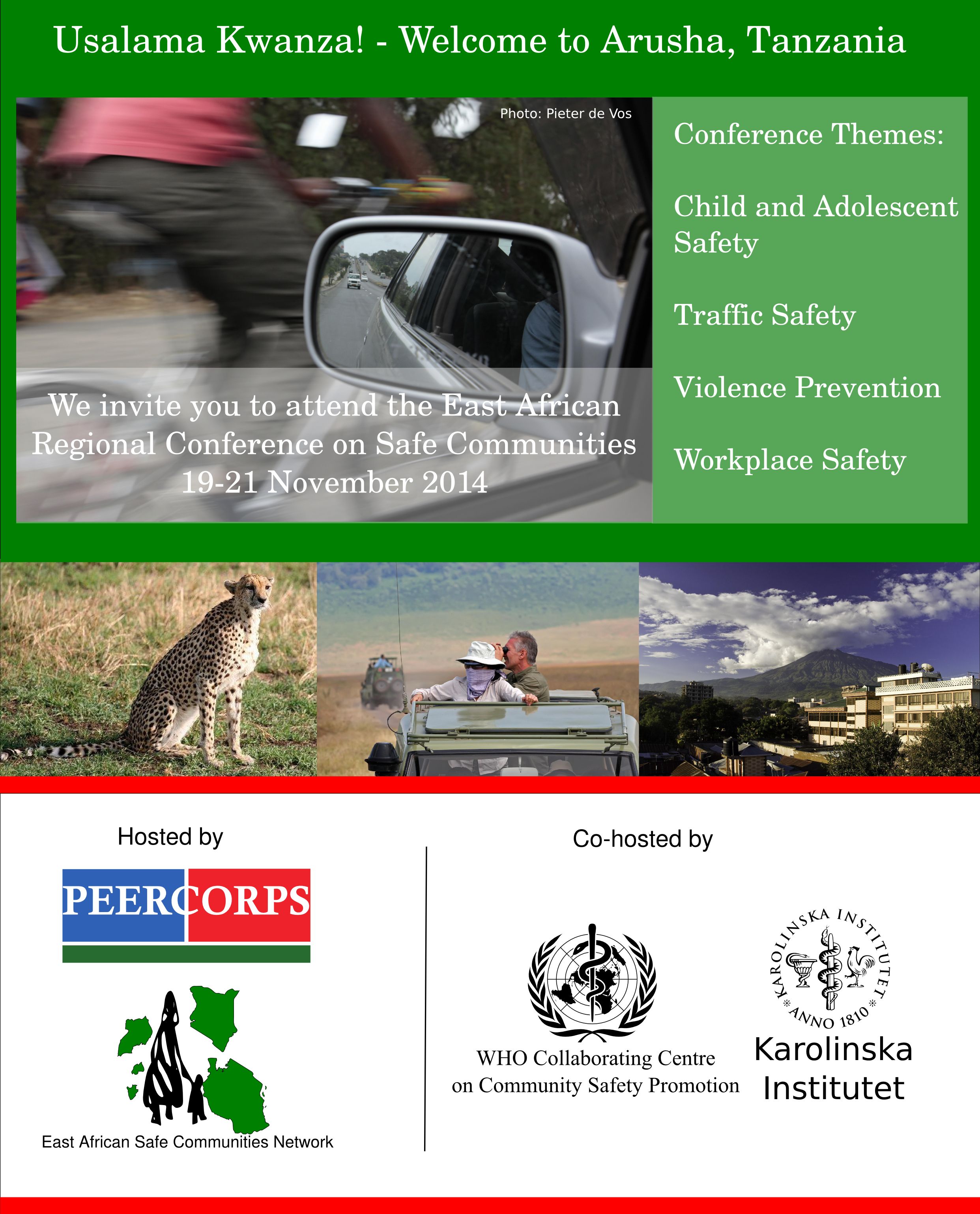 The PeerCorps Trust Fund of Tanzania in partnership with the East African Network for Safe Communities and the World Health Organization Collaborating Centre on Community Safety Promotion, announces the First East African Regional Safe Communities Conference (EARSCC) "Usalama Kwanza" to be held in Arusha, Tanzania 19-21 November 2014. The conference theme is "the role of local communities and organizations in injury prevention and safety promotion".
